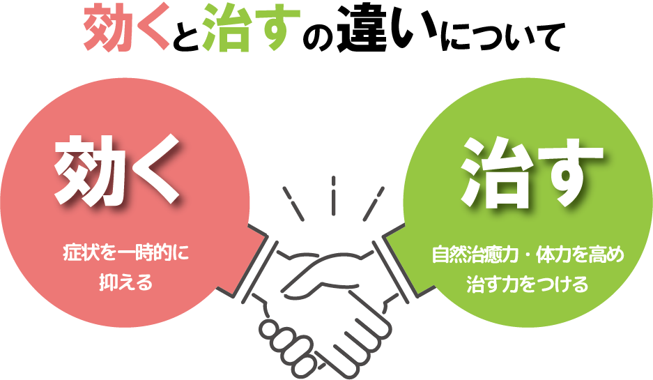 当店では、お客様の症状をお聞きする際に、「効くと治す」の違いをわかりやすくご説明するようにしています。